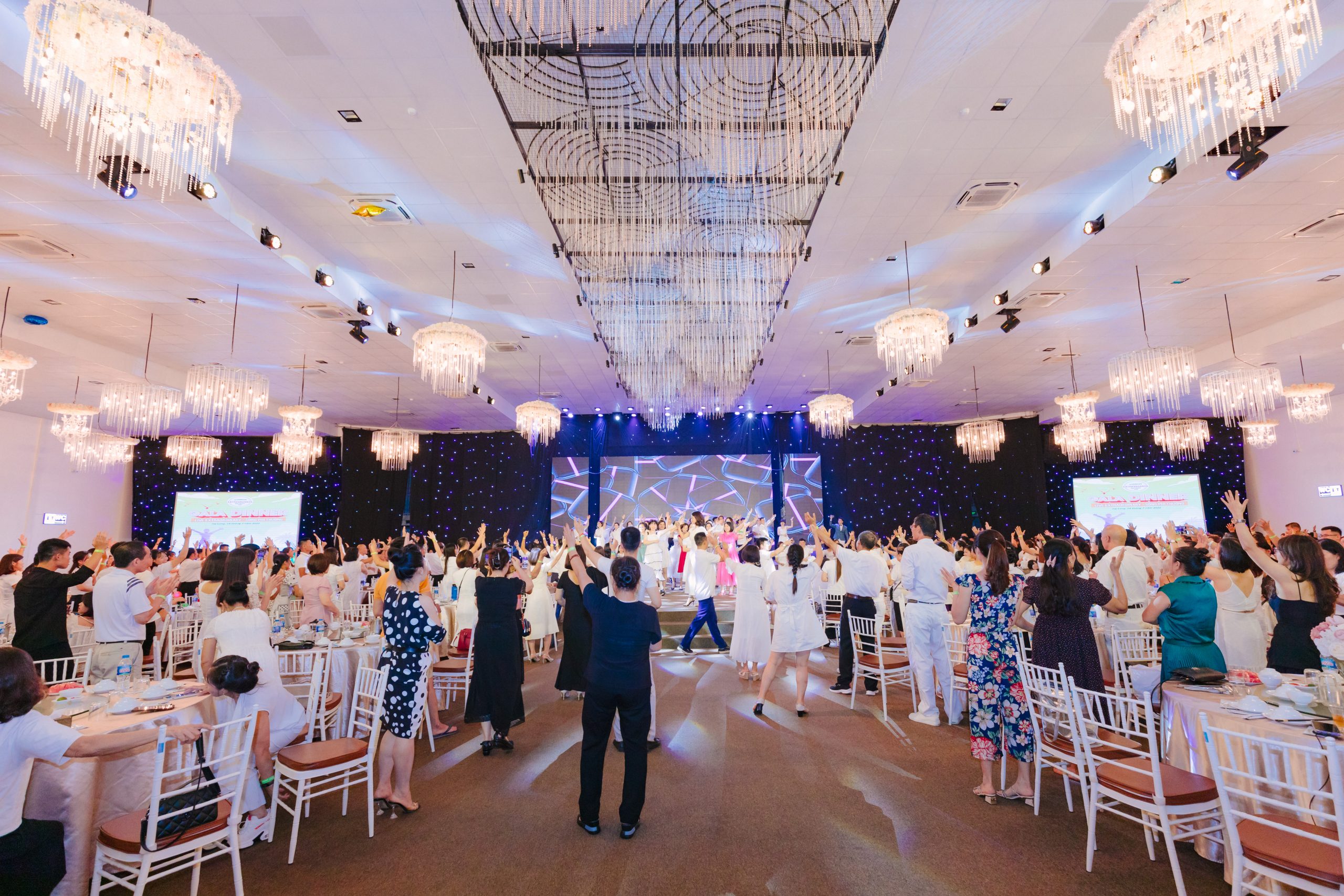 Với các tiện ích phòng tiệc như hệ thống âm thanh ánh sáng, sân khấu, màn hình LED chất lượng cao, cùng các thiết bị hỗ trợ khác sẽ khiến cho bữa tiệc Gala Dinner thêm ấn tượng, chuyên nghiệp và hấp dẫn đối với khách mời. Bên cạnh sự hỗ trợ của công nghệ là sự tận tâm, chuyên nghiệp và chu đáo của đội ngũ tư vấn, tổ chức tiệc trong suốt bữa tiệc luôn khiến khách hàng hài lòng về họ.