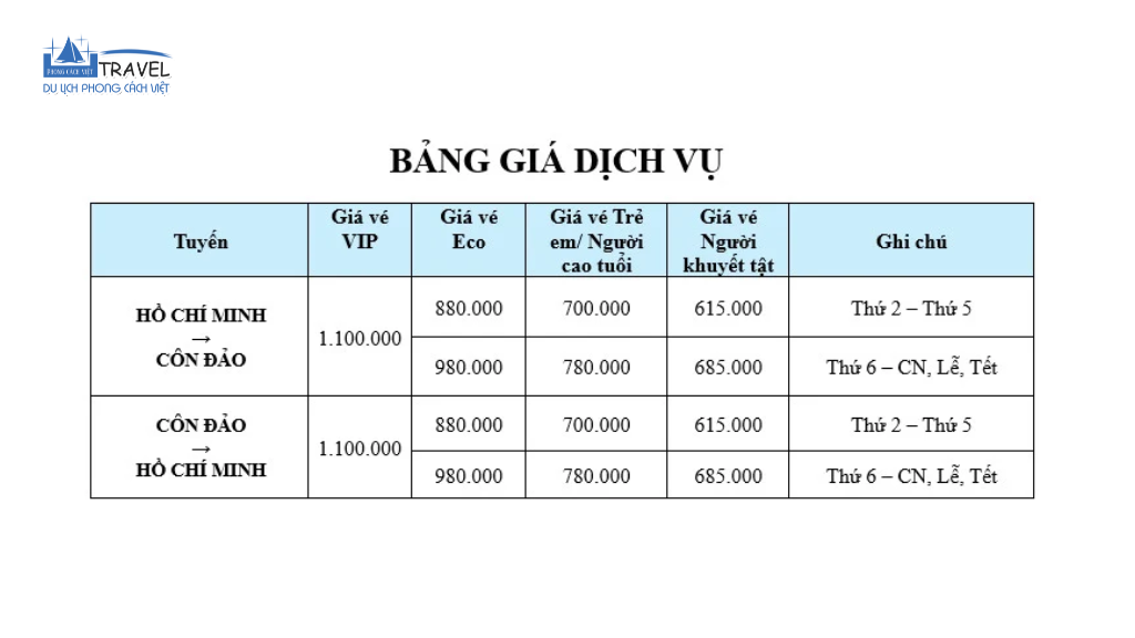 Về giá vé của tuyến vận tải hành khách bằng tàu cao tốc TP.HCM đến Côn Đảo, sẽ có mức vé dao động từ 615,00đ đến 1,1 triệu đồng mỗi chiều, phụ thuộc vào loại hạng vé, thời điểm tuyến khởi hành. Trung bình sẽ có 3 chuyến mỗi tuần cách nhau một ngày từ mỗi cảng. Thời gian tàu xuất phát lúc 7 giờ sáng từ cảng Sài Gòn – Hiệp Phước (Nhà Bè) đi Côn Đảo, và vào lúc 13 giờ từ Côn Đảo về TP.HCM tại Cảng Bến Đầm.