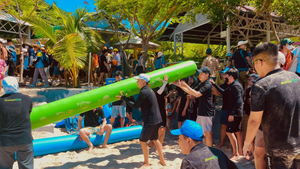 Các team tiếp tục dùng sức mạnh tập thể, cùng nhau di chuyển cây phao này từ vạch xuất phát lên vạch đích. sau đó đưa thành viên của team về.