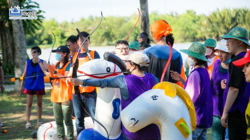 Lần lượt các thành viên của mỗi team hợp sức di chuyển đến cái mục đánh dấu sẵn, dùng cung tên để bắn phá cái mục tiêu được dựng sẵn.