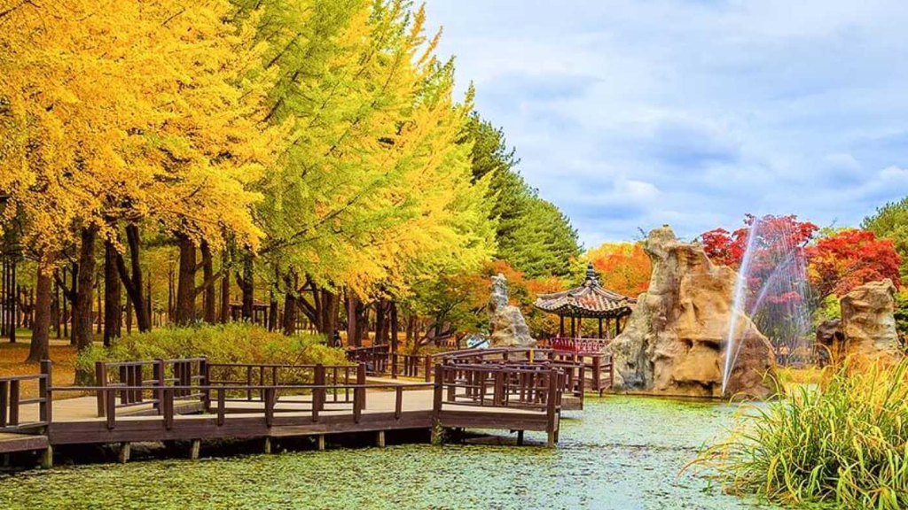 Đảo Nami – Nổi tiếng với những bản màu sắc riêng theo từng mùa: Mùa thu rực rỡ ánh vàng đỏ của tán cây phong và rừng ngân hạnh; Mùa hè có cây cối mướt xanh; Mùa đông huyền ảo với tuyết phủ trắng xóa& cuối cùng đặc biệt là vào Mùa xuân hàng trăm cây hoa anh đào nhuộm sắc hồng rực rỡ, với mùi hương ngọt ngào phảng phất không khí và là nơi ra đời của nhiều bộ phim truyền hình nổi tiếng của Hàn Quốc đã làm dấy lên cơn sốt nghệ thuật thứ bảy tại các nước CHÂU Á và thế giới như: “Bản Tình Ca Mùa Đông”.