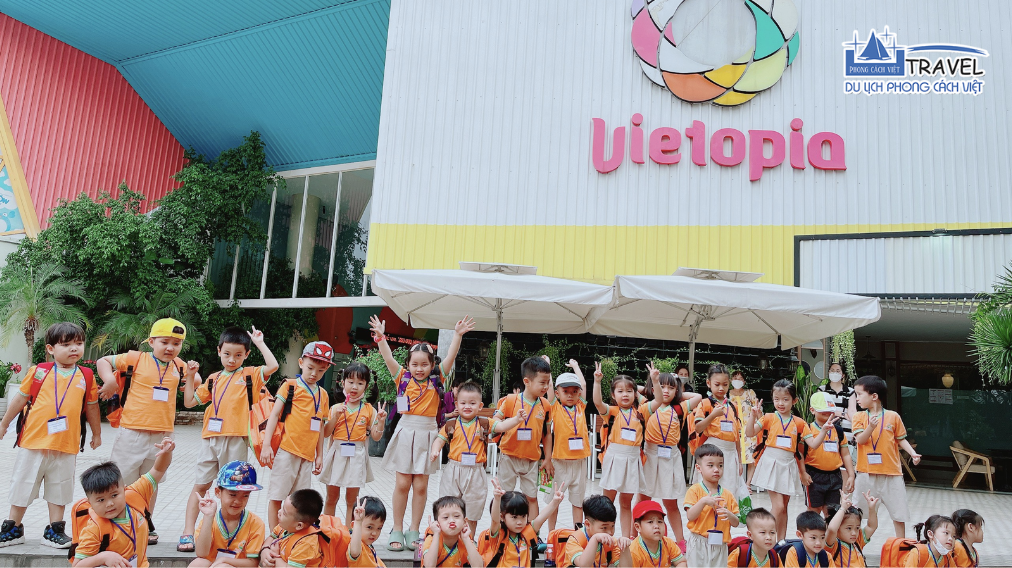 08h30: Đoàn đến Vietopia là khu vui chơi kết hợp với giáo dục tổ chức trong nhà với quy mô lớn nhất Châu Á. Chương trình tham quan Vietopia được thiết kế như một bản sao thu nhỏ của một thành phố thực. Tại đây trẻ được tham gia hơn 70 ngành nghề với hơn hoạt động hướng nghiệp khác nhau như: Biên tập báo, Điều tra viên, Bác sĩ, Kỹ sư điện, Tiếp viên hàng không, lính cứu hỏa….