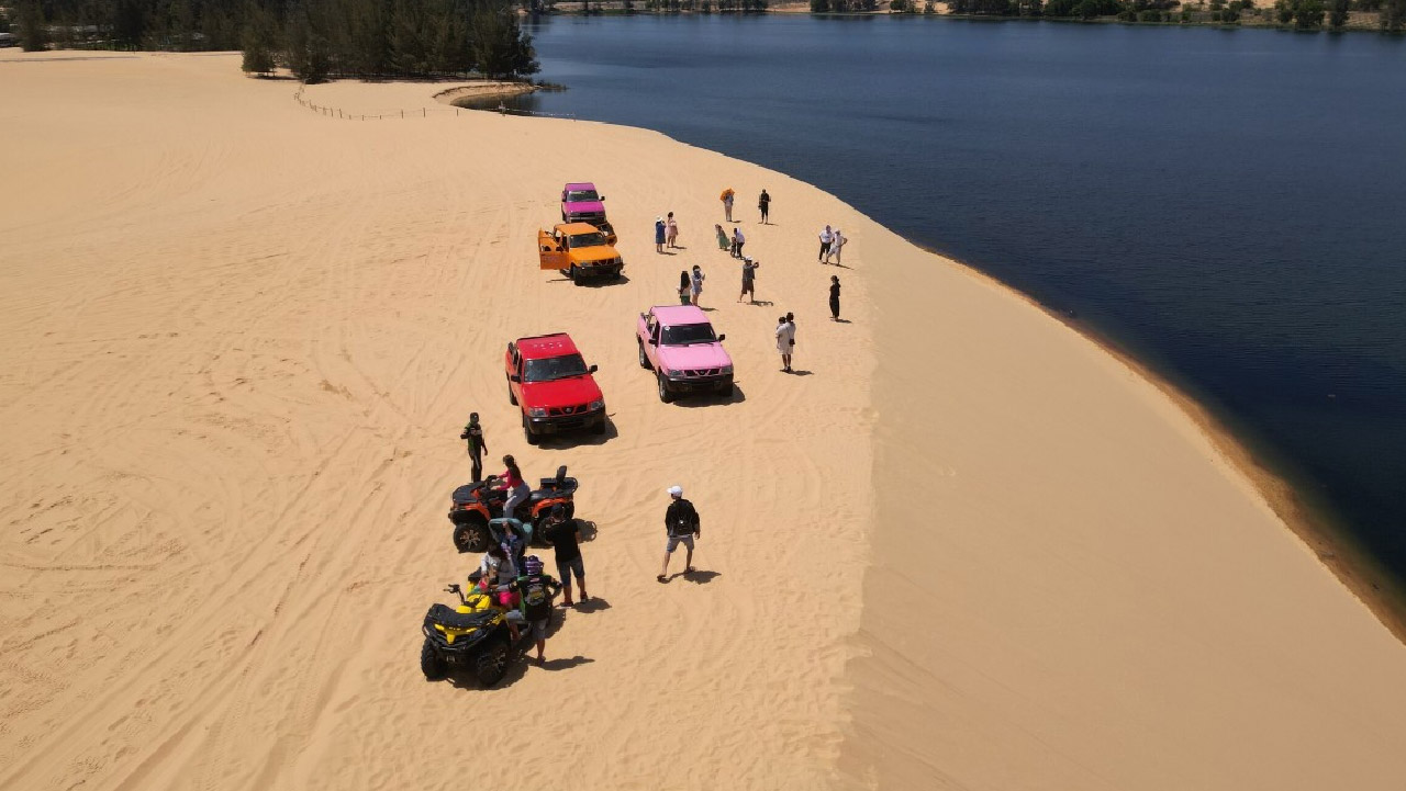 08h00: Khởi hành tham quan Khu du lịch Bàu Trắng – Nằm giữa những triền cát trắng nên Bàu Bà còn được gọi là Bàu Trắng và ngày nay cũng thường được gọi với cái tên Bàu Sen bởi trong hồ khi vào mùa sen nở, phủ kín cả một vùng hồ. Được thiên nhiên ban tặng khiến cho hồ đẹp đến tuyệt vời. Từ trên đồi cát nhìn xuống hồ phẳng lặng, xa xa những đồi cát sẫm màu nhấp nhô lên xuống khiến du khách không khỏi trầm trồ, thán phục. Quý khách có thể chọn lựa chơi các trò chơi mạo hiểm như đi xe địa hình hoặc đi xe Jeep khám phá Bàu Trắng (Chi phí tự túc).